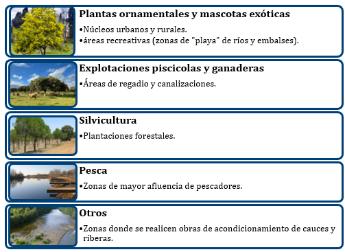 La modalidad de introducción o liberación en el medio natural varía según los grupos taxonómicos. Estas introducciones están vinculadas a distintos sectores, como la acuariofilia, jardinería, acuicultura, pesca, turismo y comercio, y se pueden clasificar en tres grupos en función de la intencionalidad: