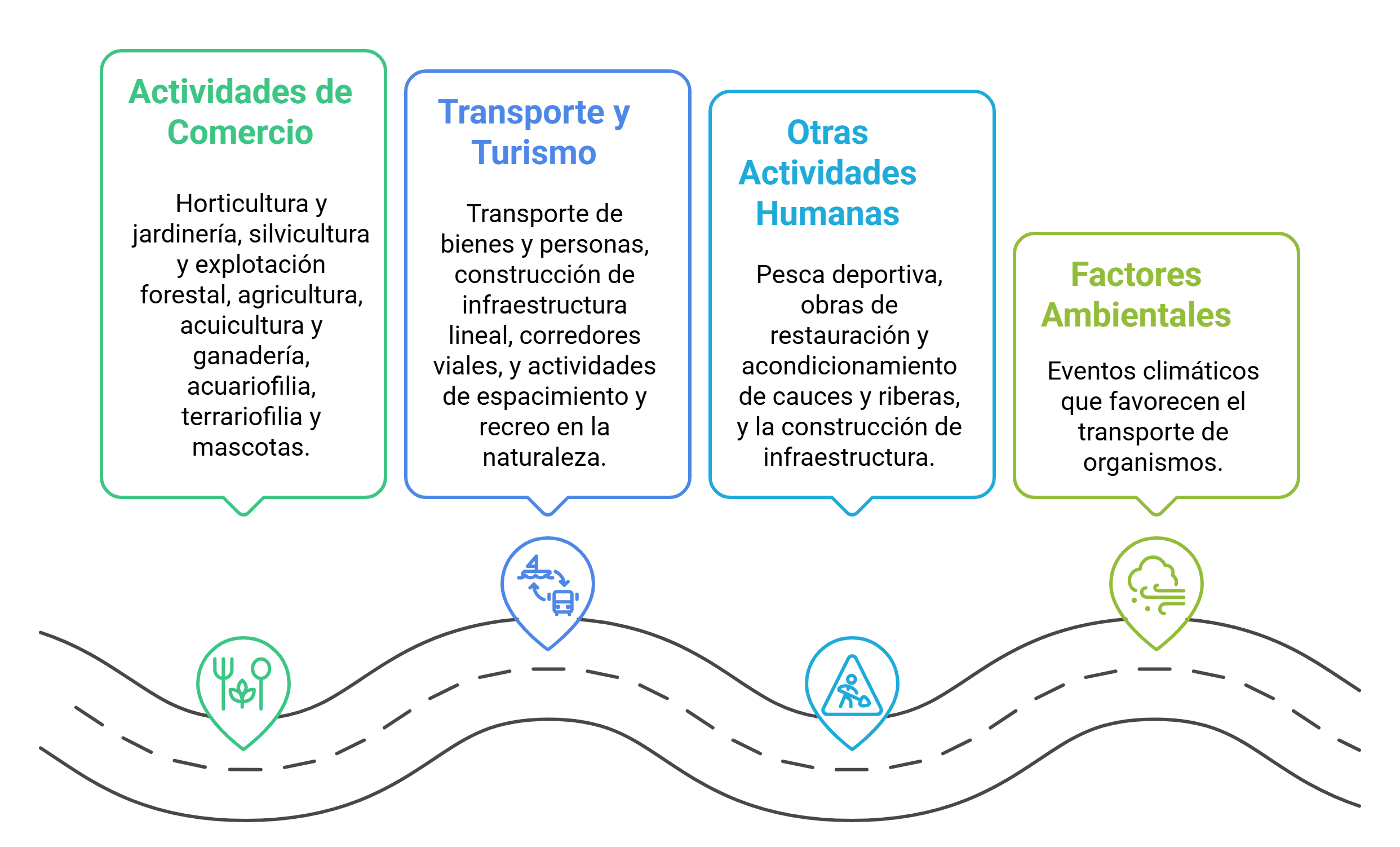 El transporte de bienes y personas es un vector significativo para el movimiento de especies, especialmente en ecosistemas acuáticos, donde la red fluvial actúa como corredor de dispersión facilitando esta propagación. La construcción de infraestructuras lineales, como carreteras y caminos, también contribuyen al riesgo de introducción de especies alóctonas. Los corredores viales son áreas idóneas para la propagación, especialmente, de semillas, plantas e insectos alóctonos. Además, el aumento del turismo activo y de actividades de esparcimiento y recreo en la naturaleza, han disparado el número de usuarios de los ecosistemas acuáticos y con ello el riesgo de nuevas invasiones y/o de dispersión de las EEI ya establecidas.