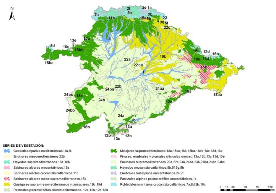 Las características bióticas principales de la cuenca se pueden englobar teniendo en cuenta que los ecosistemas de la España peninsular se encuadran en dos regiones biogeográficas: Eurosiberiana y Mediterránea (MMA, 2006; Rivas-Martínez, 2004), dentro de las cuales se diferencian subrregiones, provincias y subprovincias. En la demarcación hidrográfica internacional del Duero se distinguen, dentro de la región Eurosiberiana, las provincias Atlántica Europea (subprovincia Orocantábrica) y Pirenaico-Cevenense (subprovincia Pirenaica oriental) y, dentro de la región Mediterránea, las provincias Mediterránea Ibérica Occidental (subprovincias Luso-Extremadurense y Carpetano-Leonesa) y Mediterránea Ibérica Central (subprovincias Castellana y Oroibérica). La región eurosiberiana se reconoce en el ámbito de las cadenas montañosas del norte de la cuenca, el resto se encuentra dentro de la región mediterránea. De acuerdo con los pisos bioclimáticos y la distribución biogeográfica, en la parte española de la demarcación hidrográfica del Duero, aparecen las series de vegetación que se indican en el mapa de las series de vegetación. En él cabe destacar, por su relación con el medio hídrico, cinco series de bosque ribereño, tres en la región mediterránea y dos en la eurosiberiana.
